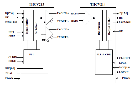 THCV213與THCV214是專門用于高速數字視頻信號傳輸的芯片組。與目前LCD電視及顯示器等常用的LVDS、DVI以及HDMI*相比,具有減少傳輸線數、節省空間、降低EMI、延長傳輸距離等優點。