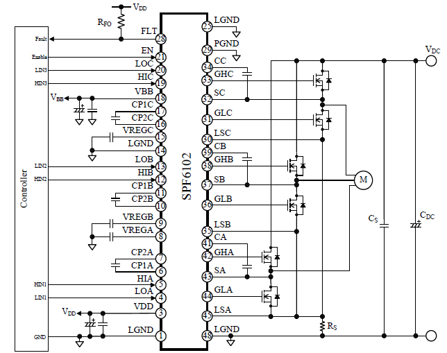 SPF6102為三相 BLDC用前置驅(qū)動(dòng) IC。適用于馬達(dá)最大耐壓低于 150V 的應(yīng)用。