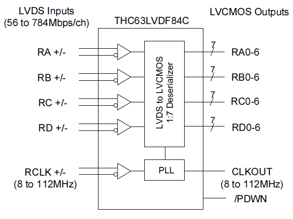 THC63LVDF84C是可以支持8-112MHz的寬闊范圍像素時鐘的LVDS接收芯片。其可對應下降沿時鐘,可廣泛應用于中小型LCD、監控攝像頭、多功能打印機、平板電腦等多個領域。