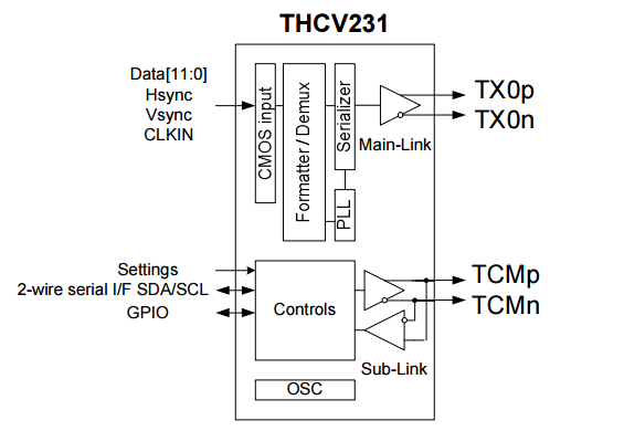 THCV231/THCV231-Q可以將最高12Bit/pixel的LVCMOS并行信號轉換為串行圖像信號的發送端IC。最其具備大傳輸速率3.2Gbps的CML串行輸出,可以將1080p60Hz的12bit攝像頭圖像信號通過一對雙絞線或者一根同軸電纜進行傳輸。此外,可以通過雙向的傳輸通道進行I2C信號傳輸。