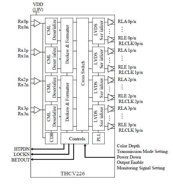 THCV226是用于視頻信號傳輸的串行接口V-by-One®HS接受端芯片,最適合用于電視機主板與LCD顯示屏之間、主板之間、模組之間的視頻信號傳輸。此芯片可以接受4lane V-by-One®HS信號。其中每lane可以傳輸32位視頻數據及3位控制信號,總共可以支持1080p/30bit/120Hz或與之相當的視頻信號傳輸。最大傳輸速率為3.4Gbps/lane。
